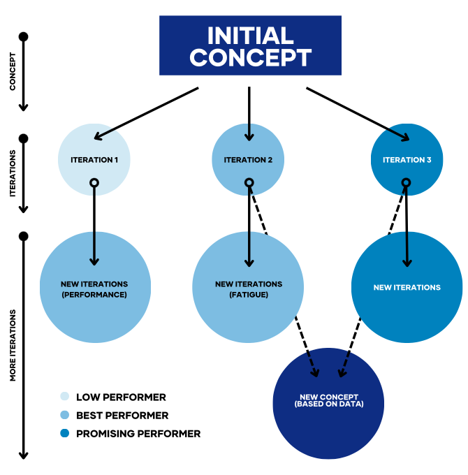 An iterative testing approach utilizes data and creative learning to create assets that are proven to perform and optimize your brand’s efforts in new customer acquisition and retention. Identifying primary creative pillars and creative strategy is the key to knowing how your assets will perform.