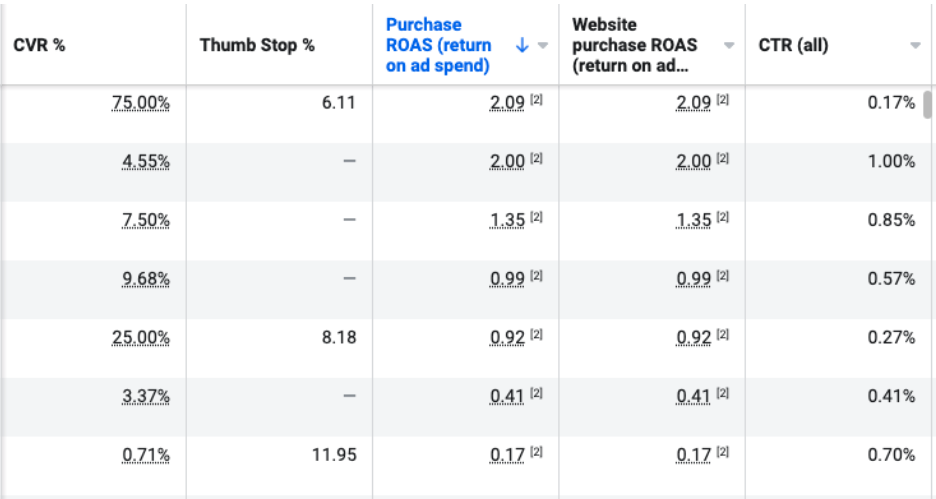 - ROAS is a good first marker to look at, but depending on creative strategy will only give you part of the story about your creative performance