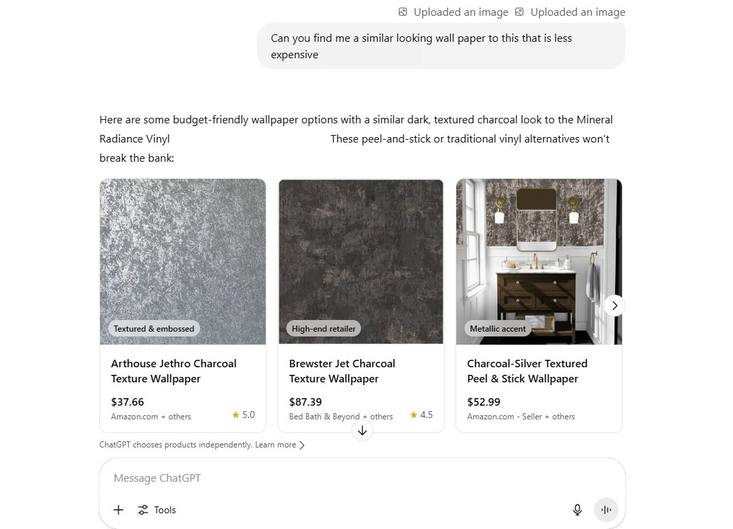 A great example? When Blue Wheel’s own CEO wanted to find affordable wallpaper that matched a specific style, he turned to ChatGPT. By uploading a photo of his existing decor and prompting the AI with a budget and style preference, he quickly received curated, shoppable suggestions, all without scrolling through dozens of irrelevant listings.
