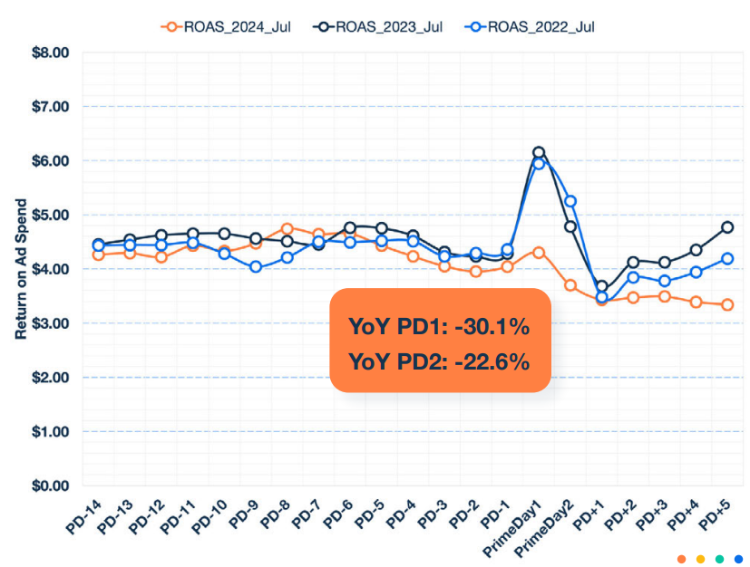 If we observe the return on ad spend (ROAS), it declined ahead of Prime Day before rebounding. It's important to maintain steady advertising even when ROAS drops during tentpole moments. Use brand awareness tactics to build up interest prior to big sales events.