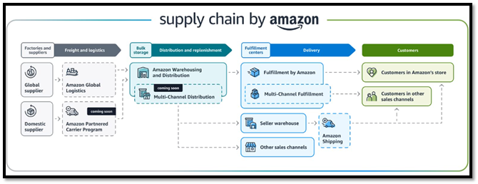 “With Supply Chain by Amazon, we pick up inventory from your manufacturing facilities, ship it across borders, handle customs clearance and ground transportation, store inventory in bulk, manage replenishment across Amazon and other sales channels, and deliver directly to customers.”