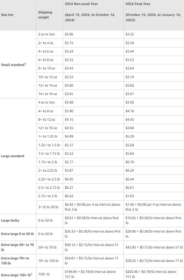 The FBA Holiday Peak Fulfillment Fee will return shortly - kicking off during the busiest months of the year. For the 2024 Holiday season, these fees will take place from October 15 through January 14. Curious about how it will impact your bottom line? Here are the peak-period rates for US sellers: