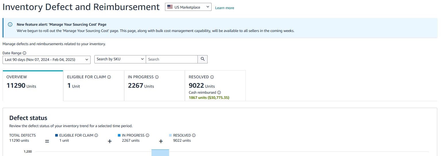 Sellers can utilize the new Inventory Defect and Reimbursement portal to streamline the management of their FBA-related defects and reimbursements. The portal centralizes all defects into one view, allowing sellers to track them across three categories: Eligible for Claim, In Progress, and Resolved. The IDR portal provides detailed insights into reimbursement opportunities, enabling sellers to identify high-defect SKUs and recurring trends that could lead to future claims.