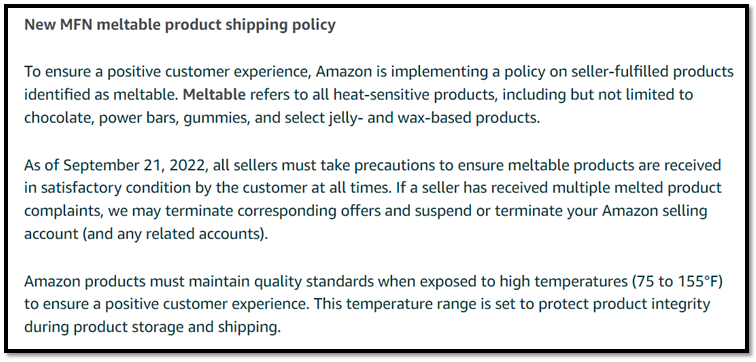 Repeated complaints can result in your selling account being shut down eventually. If FBM sellers can't guarantee that meltable products will arrive to the customer intact, it’s a good idea to consider closing the listings during these warmer months.